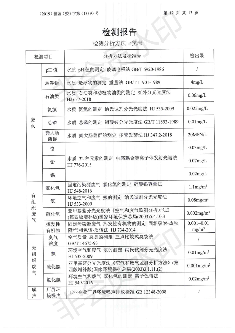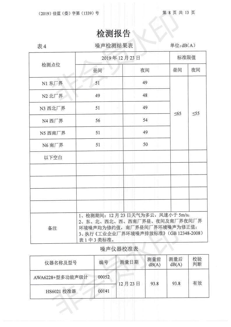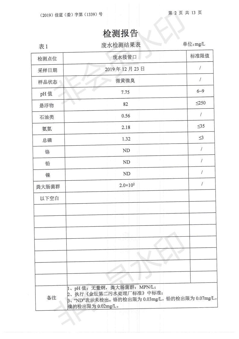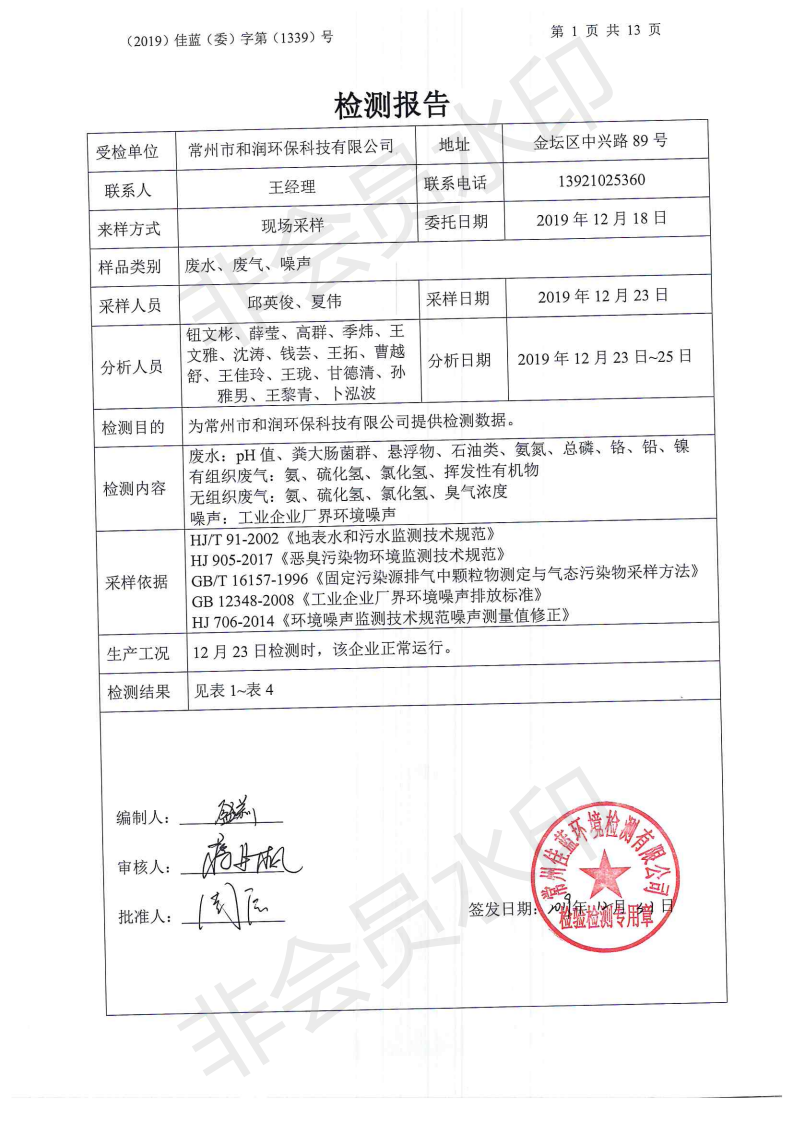 2019年12月我司委托常州佳藍(lán)環(huán)境檢測(cè)有限公司對(duì)本司廠區(qū)范圍內(nèi)的廢水、有組織廢氣、無(wú)組廢氣、噪聲等進(jìn)行檢測(cè)并提供檢測(cè)數(shù)據(jù),檢測(cè)時(shí),本司正常生產(chǎn)運(yùn)行。以下為常州佳藍(lán)環(huán)境檢測(cè)有限公司提供檢測(cè)報(bào)告。
